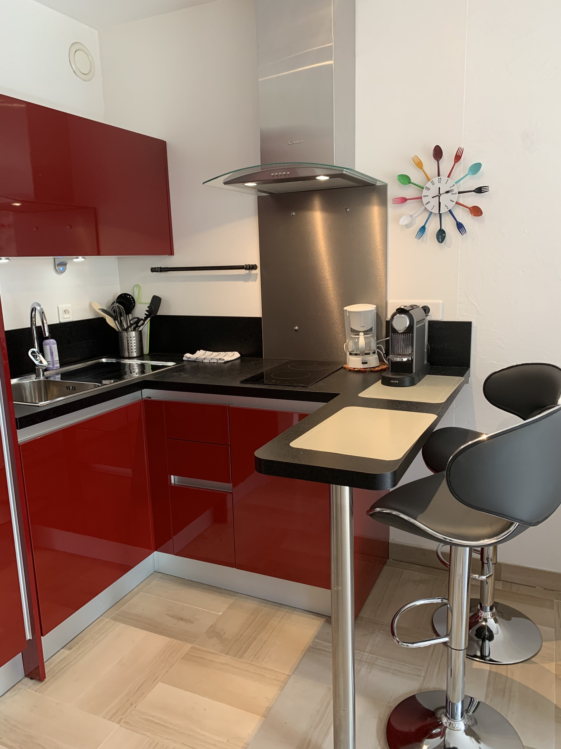 The kitchen area is fully equipped with a refrigerator, microwave, electric stove, Nespresso coffee machine, kettle, and toaster.